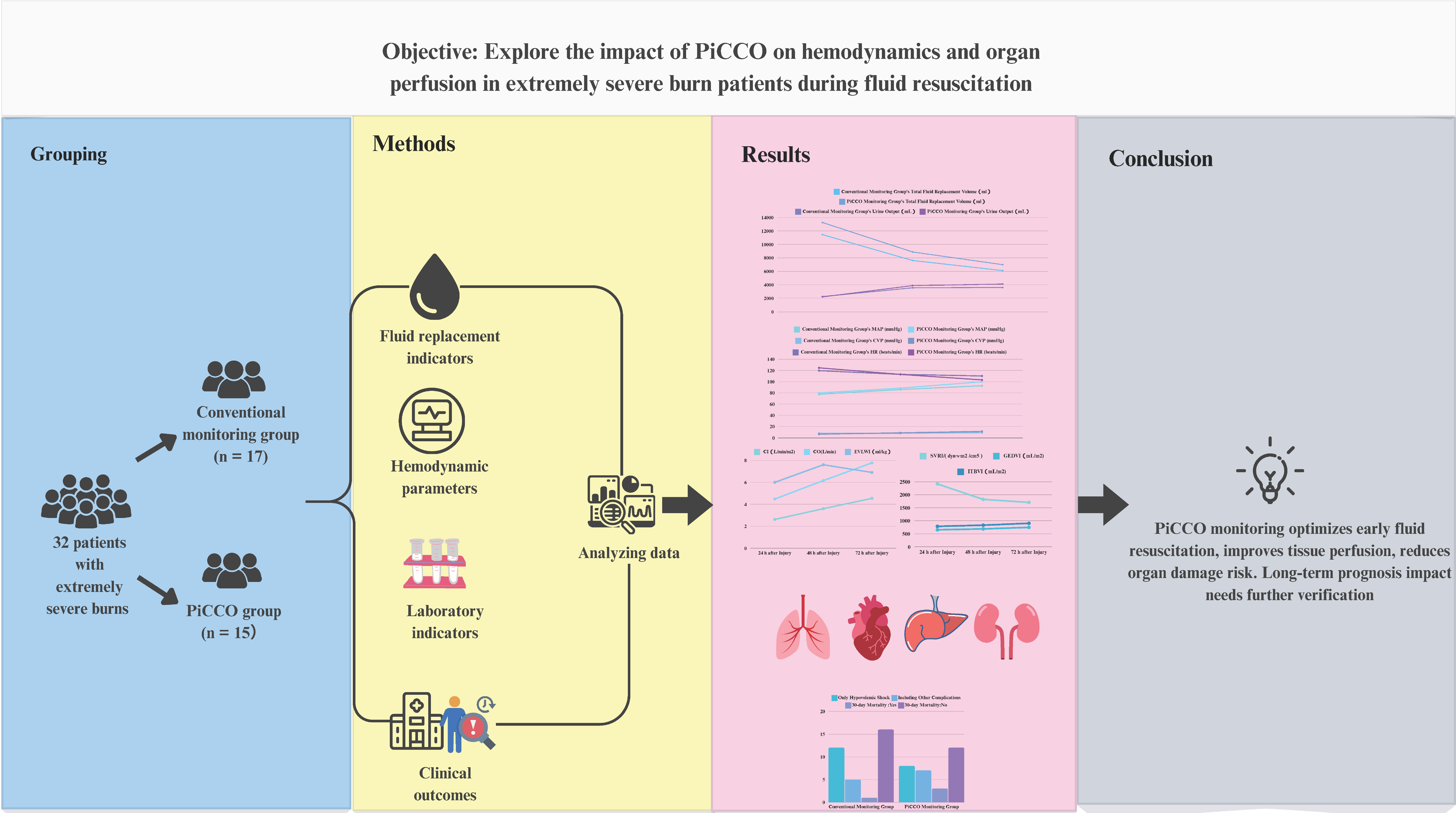 Methods: This study adopted a retrospective cohort study design. A total of 32 patients with extremely severe burns admitted to the Burn Department of the First Affiliated Hospital of Anhui Medical University from June 2022 to July 2024 were included. According to the monitoring methods, they were divided into a conventional monitoring group ( n = 17 ) and a PiCCO group ( n = 15 ). The basic data, fluid replacement indicators (total fluid replacement volume, urine output, fluid replacement coefficient, urine output per hour per kilogram of body weight), hemodynamic parameters [mean arterial pressure (MAP), central venous pressure (CVP), heart rate (HR), cardiac index (CI), cardiac output (CO), systemic vascular resistance index (SVRI), extravascular lung water index (EVLWI), global end-diastolic volume index (GEDVI), intrathoracic blood volume index (ITBVI)], laboratory indicators [lactate (Lac), base excess (BE), creatine kinase (CK), creatine kinase - MB (CK - MB), alanine aminotransferase (ALT), aspartate aminotransferase (AST), blood urea nitrogen (BUN), serum creatinine (Scr)] and clinical outcomes (complication incidence, 30 - day mortality, antibiotic use time, hospital stay and cost) of the two groups were compared. T-test, repeated-measures analysis of variance, Mann-Whitney U test, Bonferroni correction, chi-square test, and Fisher's exact probability method were used for statistical analysis.