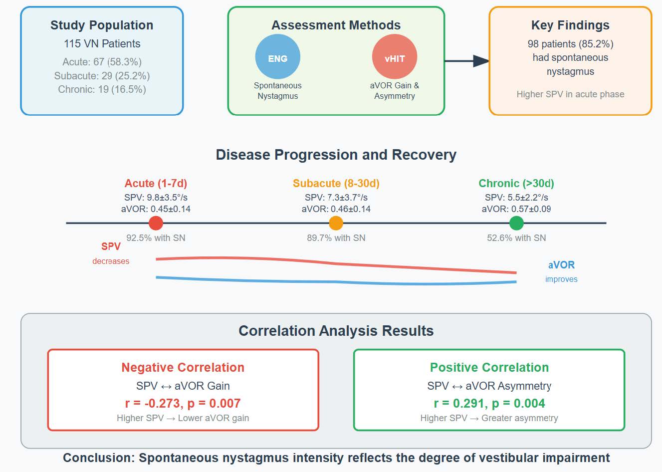 Methods: A total of 115 VN patients were enrolled, who were divided into acute phase (1 – 7 days), subacute phase (8 – 30 days) and chronic phase (>30 days) according to the course of disease. Quantitative assessment of SN was performed using electronystagmography (ENG), with particular focus on the slow phase velocity (SPV) in the horizontal plane. Simultaneously, vestibular-ocular reflex function was systematically evaluated through video head impulse test (vHIT), with quantitative measurements of angular vestibulo-ocular reflex (aVOR) gain and asymmetry of the affected semicircular canals.